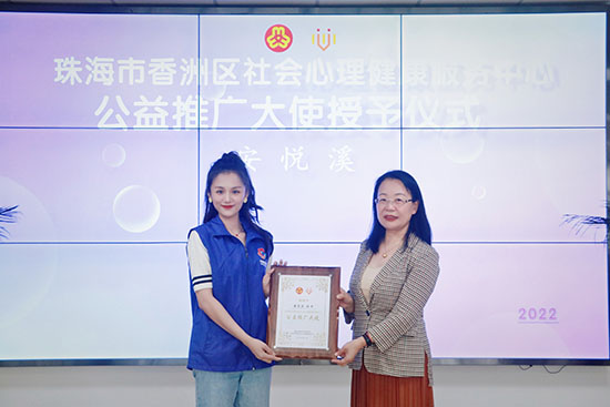 香洲区社会心理健康服务中心根据孩子的年龄特点,精心设计了活动环节和绘本故事。安悦溪不仅亲自教家长和孩子们跳起生命教育律动操《用爱追逐梦》,还绘声绘色地为孩子们讲述了儿童绘本《熊宝宝找幸福》,通过生动形象的语言和具有表现力的表演形式,安悦溪带领孩子们走进这个妙趣横生的故事,激发了孩子们丰富的思考能力。孩子们听得津津有味,积极踊跃参与到互动当中,现场气氛十分欢乐。当家长和孩子们打开心灵的大门,真诚沟通的瞬间,她不禁潸然泪下。安悦溪表示,想通过此次活动,为孩子们传递正向、积极、温暖的力量,也想为孩子们的童年留下一些美好记忆。此外,安悦溪现场还被授予“公益推广大使”的称号。